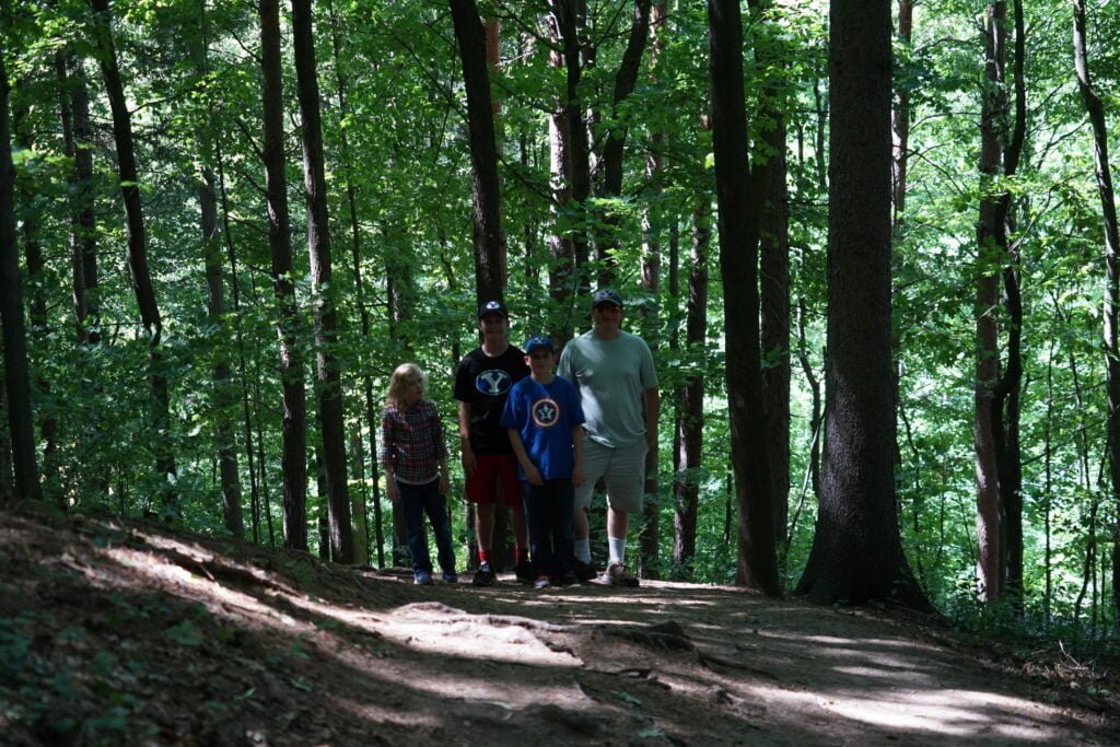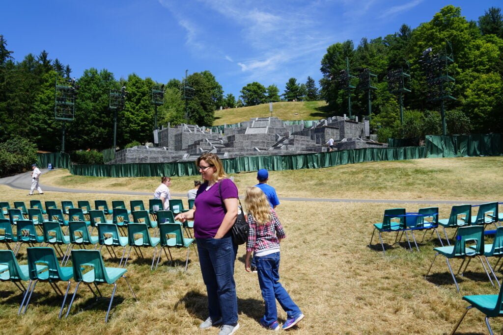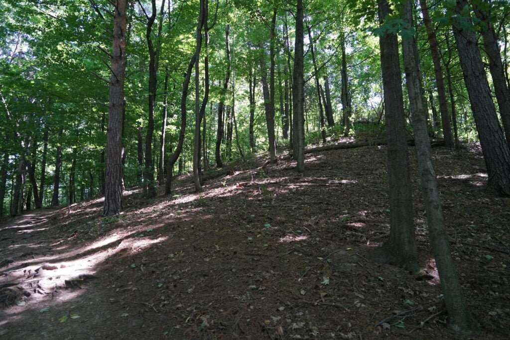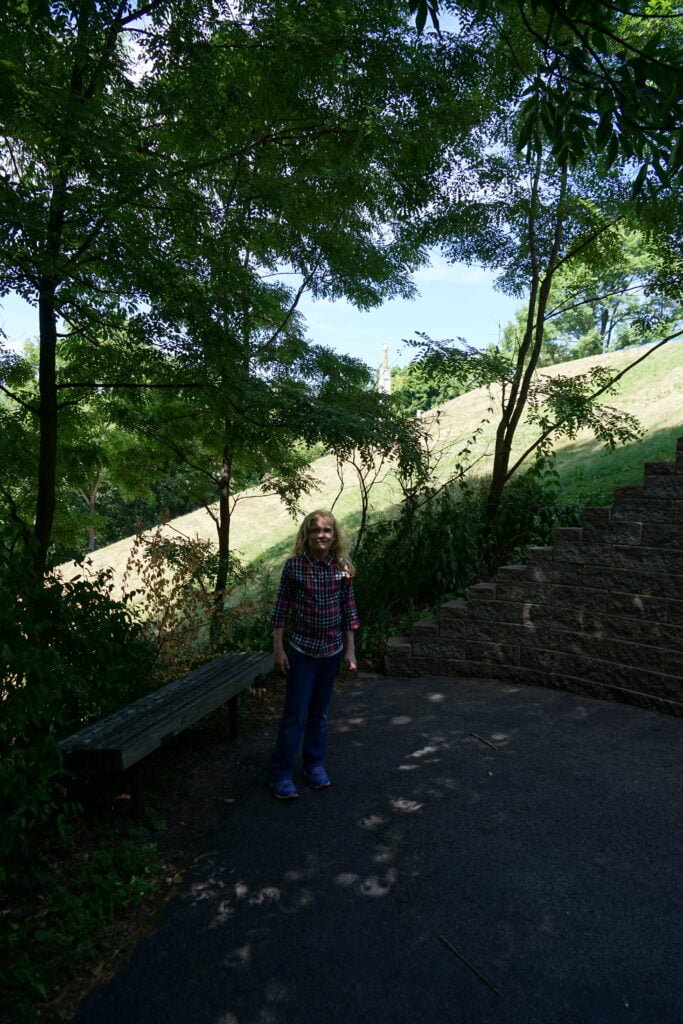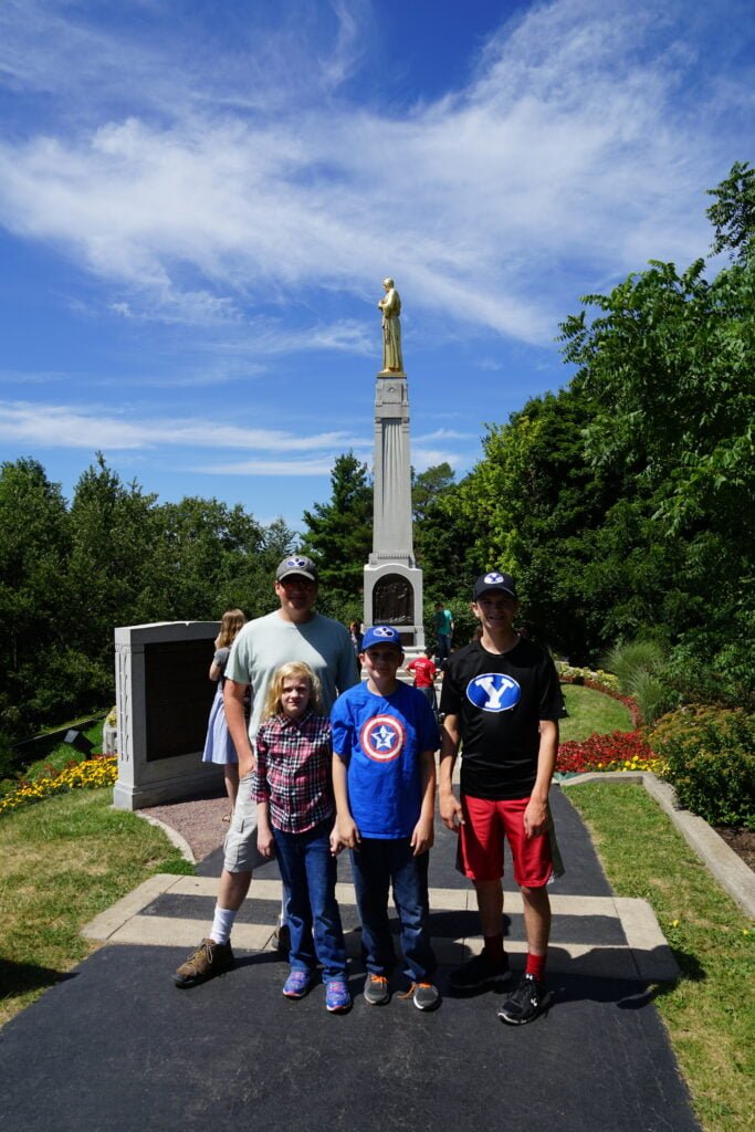 According to Google Maps, a straight line from the Smith Family Farm to the Hill Cumorah is about 2.6 miles. Using current roads, it takes about 5 minutes to drive from the farm to the Hill Cumorah. During my family’s visit in July 2018, we were able to walk to the top of the hill and see the monument that is there now. It is currently heavily forested, and has a steep slope. At the time of our visit, the Hill Cumorah Pageant was still in production, and from one of the photos below (with my wife and daughter in the foreground) you can see the set of the pageant and the steepness of the hill behind it.